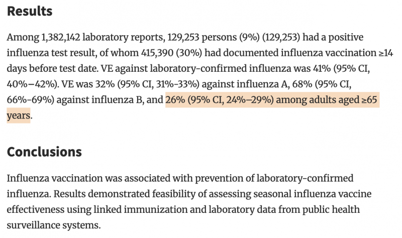 mit ausreichend großen Zahlen und daher bestechend kleinen Vertrauensbereichen errechneten die CDC die Impfstoff-Effektivität für die Hauptzielgruppe der Älteren über 65 Jahre mit 26% (95% KI 24-29%).