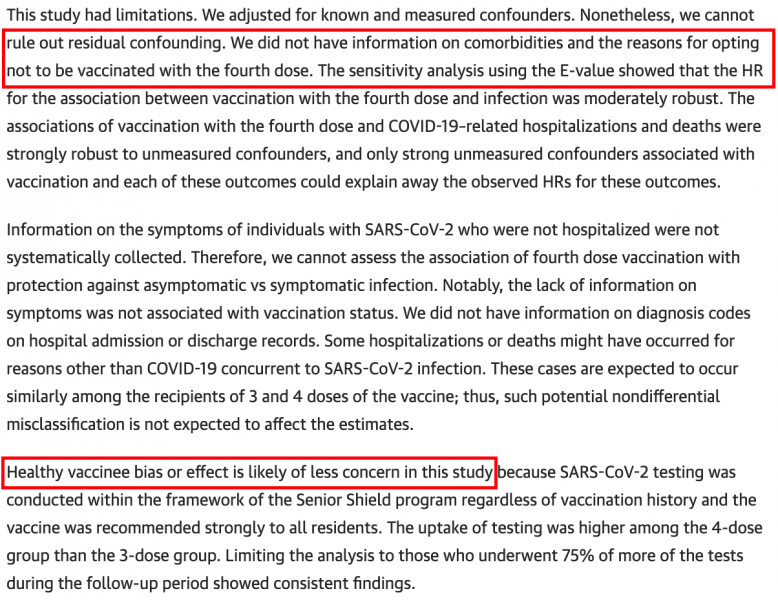 Es bleibt offen, mit welchem Recht die Autoren behaupten, ein möglicher "healthy vaccinee effect" spiele wahrscheinlich keine große Rolle, wenn sie parallel einräumen, sie wüssten nicht, warum die in den Altenheimen massiv beworbene vierte Impfung im Einzelfall abgelehnt wurde und auch über Vorerkrankungen habe man keine Informationen.