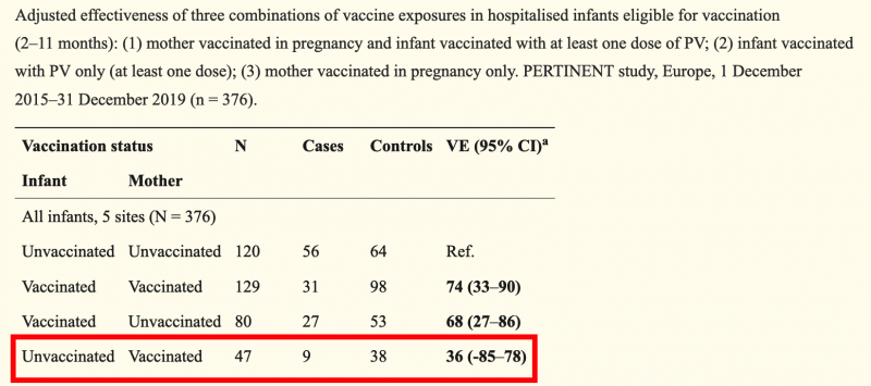 Bei Säuglingen ab dem Alter von 2 Monaten wurden 75% mit einem vergleichbaren Vertraunsbereich nur für die Kombination aus eigener und mütterlicher Impfung erreicht. Rein rechnerisch ergab sich für die ausschließliche Impfung der Mutter eine VE von 38%, die allerdings durch den weit in den negativen Bereich reichenden Vertrauensbereich ad absurdum geführt wird.