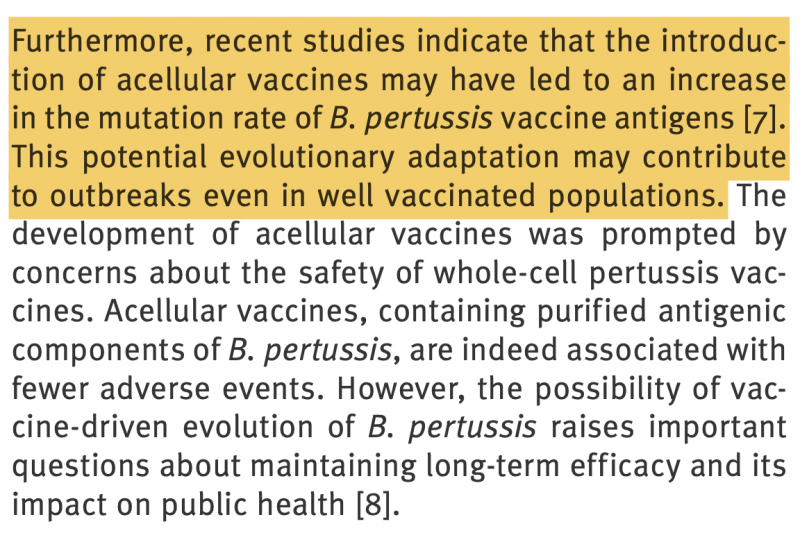 Die Autoren weisen darauf hin, dass die Pac, die deutlich kürzer wirkt als die frühere Keuchhustenimpfung, die Mutation Impfstoff-resistenterer Keuchhustenstämme befördert habe (vaccine driven evolution) und damit möglicherweise mittelbar (mit-)verantwortlich sei für die ungewöhnliche Epidemie in Ländern mit eigentlich hoher Durchimpfungsquote.