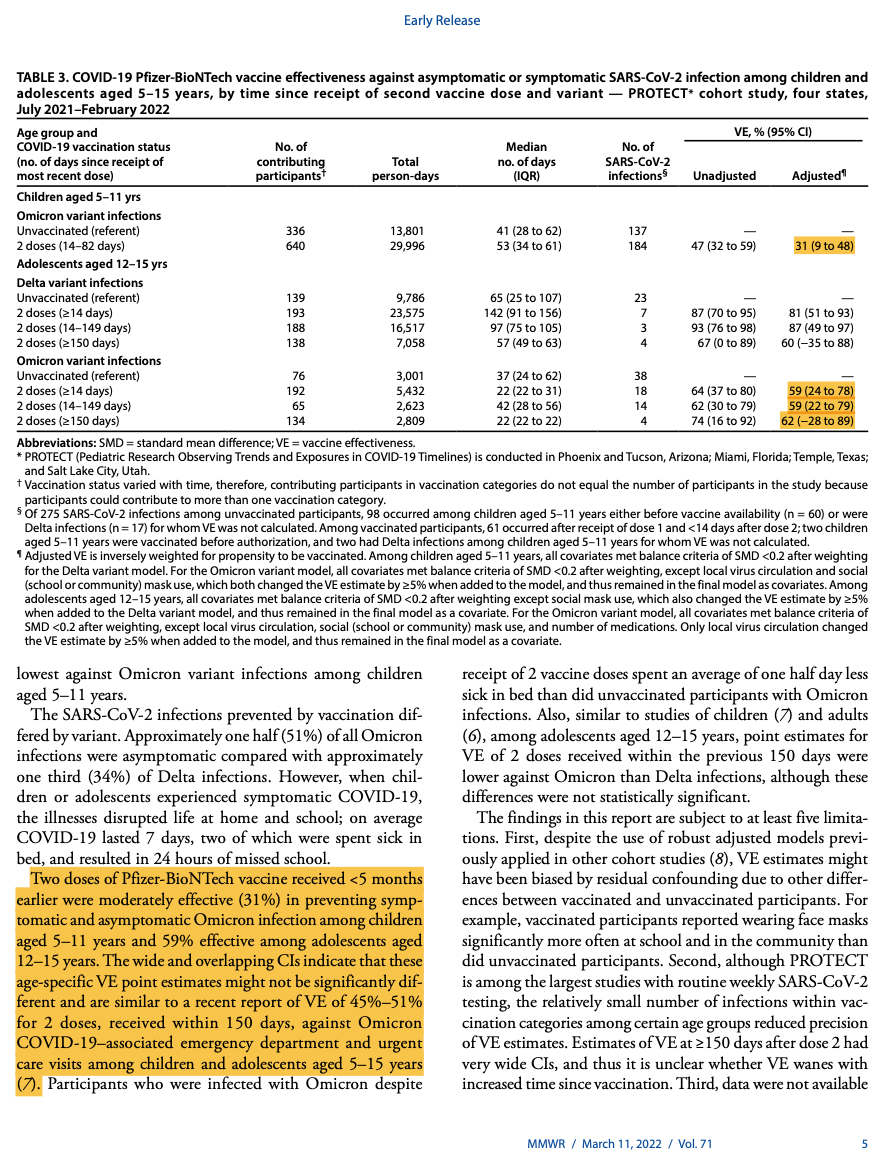 Effectiveness of 2-Dose BNT162b2 (Pfizer BioNTech) mRNA Vaccine in Preventing SARS-CoV-2 Infection Among Children Aged 5–11 Years and Adolescents Aged 12–15 Years — PROTECT Cohort, July 2021–February 2022 | MMWR