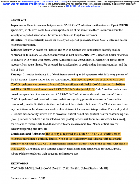 - "Keine der Studien lieferte einen Nachweis mit ausreichender wissenschaftlicher Sicherheit, ob eine SC2-Infektion bei Kindern mittel- oder langfristige gesundheitliche Auswirkungen hat, geschweige denn, in welchem Ausmaß"
