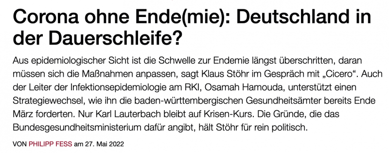 Aus epidemiologischer Sicht ist die Schwelle zur Endemie längst überschritten, daran müssen sich die Maßnahmen anpassen, sagt Klaus Stöhr im Gespräch mit „Cicero“. Auch der Leiter der Infektionsepidemiologie am RKI, Osamah Hamouda, unterstützt einen Strategiewechsel, wie ihn die baden-württembergischen Gesundheitsämter bereits Ende März forderten. Nur Karl Lauterbach bleibt auf Krisen-Kurs. Die Gründe, die das Bundesgesundheitsministerium dafür angibt, hält Stöhr für rein politisch.
