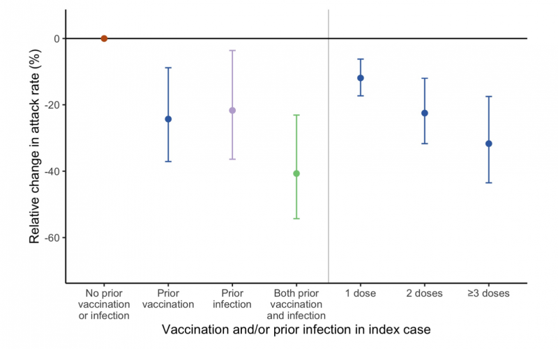 - dass das Risiko verglichen mit der SAR immun-naiver Indexfälle (weder vorangegangene Infektion, noch Impfung) nur mäßig verringert war