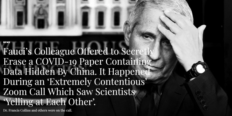 Fauci's Colleague Offered to Secretly Erase a COVID-19 Paper Containing Data Hidden By China. It Happened During an 'Extremely Contentious' Zoom Call Which Saw Scientists 'Yelling at Each Other'.