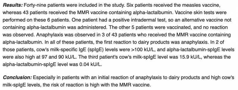 Von Bedeutung ist diese Beobachtung dennoch, da angesichts der deutschen Masernimpfpflicht immer wieder Eltern den einzig verbliebenen Masern-Einzelimpfstoff Measles live™ des indischen Herstellers Serum Institute of India verimpfen lassen. Dieser in Deutschland zwar nicht zugelassene, aber über deutsche Apotheken aus der Schweiz problemlos erhältliche Impfstoff enthält, genau wie der MMR-Impfstoff desselben Herstellers, Lactalbumin und wäre damit bei einer echten Kuhmilchprotein-Allergie streng kontraindiziert.