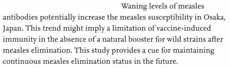 Japan hat nach den WHO-Kriterien die Masern-Elimination seit vielen Jahren erreicht. Eine aktuelle Studie hat auf der Grundlage routinemäßig erhobener Serumproben für den Zeitraum zwischen 2003 (vor der Elimination) bis 2020 (deutlich nach der Elimination) erhoben, wieviele Menschen Masern-Antikörper im Blut aufweisen (Seroprävalenz) und wie hoch die gemessenen Antikörper-Spiegel im Mittel sind (als Korrelat für die Zuverlässigkeit des Schutzes). Auf dieser Grundlage wurde die R(e), also die effektive Reproduktionszahl der Masern, in Japan für diesen Zeitraum berechnet.