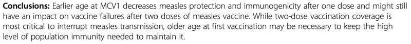 Eine systematische Meta-Analyse bestätigt Befürchtungen, dass der (auch in D) empfohlene frühe Impfzeitpunkt (vor dem ersten Geburtstag) für die erste Masernimpfung (MCV1) deren Wirksamkeit kurz- und langfristig kompromittiert: