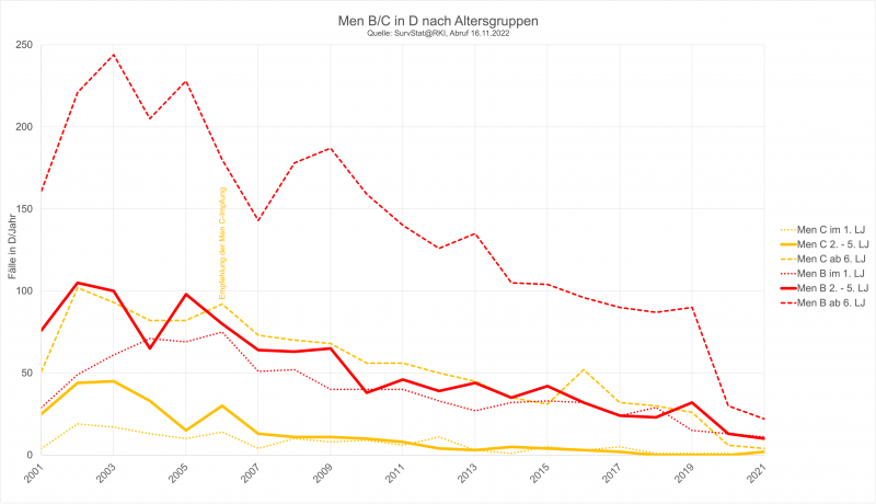 Schaut man auf die deutschen Zahlen, könnte die STIKO im Brustton der Überzeugung sagen: "Der Verzicht auf ein Men-B-Impfprogramm ist mit einem anhaltenden positiven Effekt gegen Men B-Erkrankungen bei Kindern in D assoziiert...".