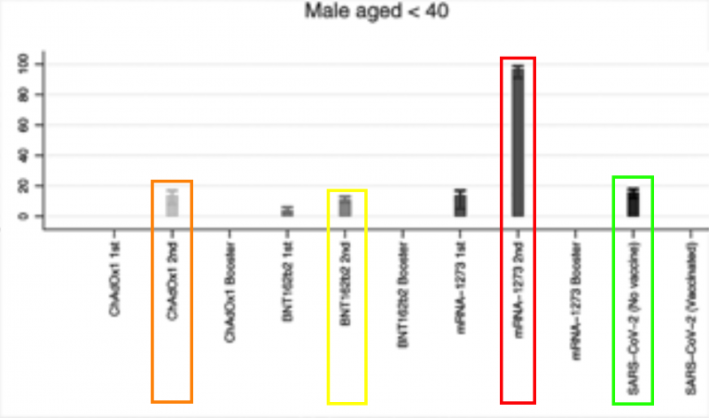 Hauptrisikogruppe bleiben junge Männer unter 40 Jahre; hier liegt die Zahl zusätzlicher Myokarditis-Fälle pro 1 Mio Betroffener in den 28 Tagen