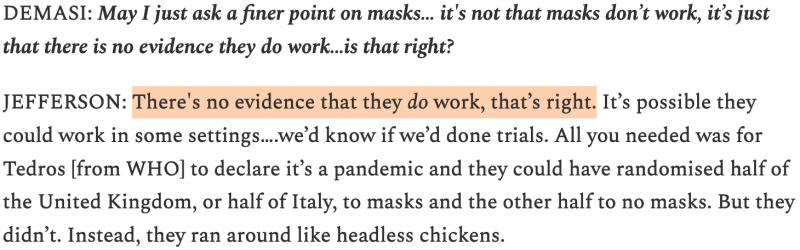 Wissenschaftlich präzise formuliert: "There is no evidence that they do work" - es gibt keinen wissenschaftlichen Beweis, dass sie wirken. Das ist nicht der Beweis, dass sie nicht wirken, aber beweispflichtig sind eben nicht die Masken-Kritiker, sondern die Masken-Befürworter (was gerne übersehen wird...).