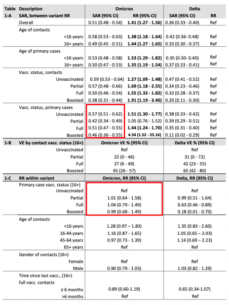 - auch das variantenintern berechnete relative Risiko der Übertragung in Abhängigkeit vom Impfstatus des Index zeigt dies: setzt man das Risiko des ungeimpften Indexfalles als Maßstab (also als 1), beträgt dies für volltändig geimpfte Indexfälle 1,04, für geboosterte 0,99.