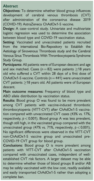 das Risiko, nach dem Covid-Impfstoff von AstraZeneca die gefürchtete Hirnvenenthrombose zu erleiden, korreliert signifikant mit der Blutgruppe: Geimpfte mit Blutgruppe "0" hatten mit Abstand das höchste, solche mit Blutgruppe "A" immer noch ein deutlich erhöhtes Risiko verglichen mit Ungeimpften.
