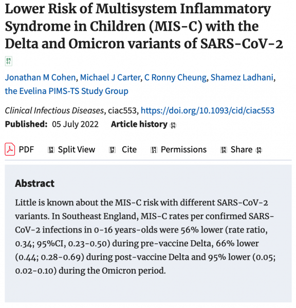 Lower Risk of Multisystem Inflammatory Syndrome in Children (MIS-C) with the Delta and Omicron variants of SARS-CoV-2 | Clinical Infectious Diseases | Oxford Academic