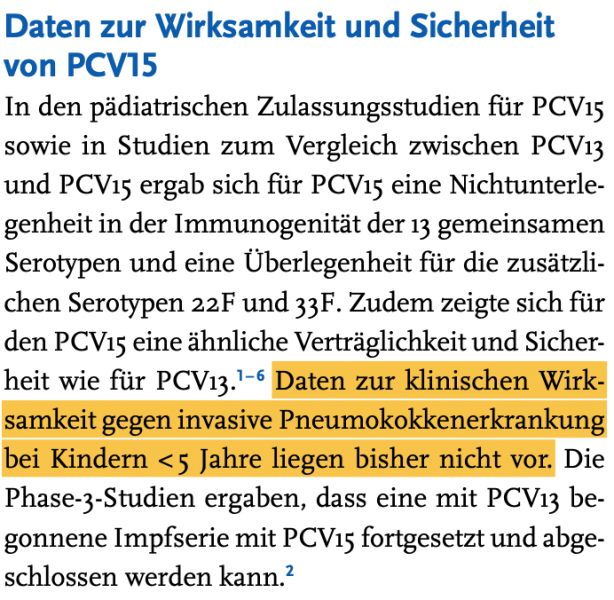 Die STIKO weist im Epidemiologischen Bulletin 20/2023 ausdrücklich darauf hin, dass es für den neuen Pneumokokken-Impfstoff für Kinder Vaxneuvance™ (der im Vergleich zum Vorgänger-Modell 15 statt 13 von insgesamt über 100 Pneumokokken-Serotypen enthält) keinerlei Daten zur klinischen Wirksamkeit für Kinder unter 5 Jahren gibt.
