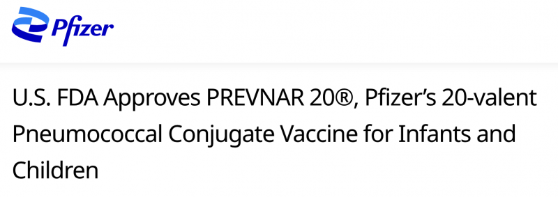 Die US-amerikanische FDA ließ mit Prevnar 20 einen neuen Pneumokokken-Konjugatimpfstoff für Säuglinge und Kleinkinder zu. Dieser enthält von den über 100 Pneumokokken-Serotypen jetzt 20 (statt bisher 13).