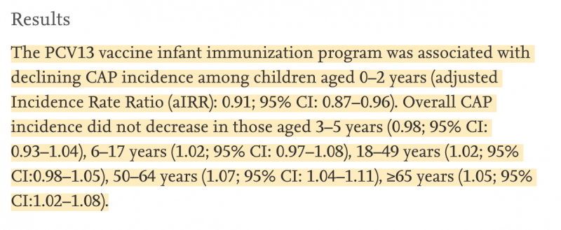 Es fand sich eine mit 9% sehr geringe Abnahme der Häufigkeit bei den geimpften 0 - 2-Jährigen selbst ohne jeden Herdeneffekt in anderen Altersgruppen (im Gegenteil: bei älteren Erwachsenen kam es sogar zu einer leichten Zunahme der CAP).