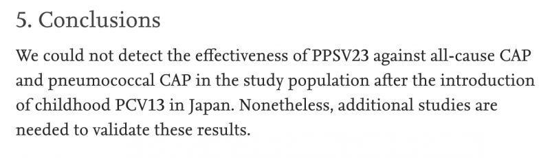 Die gerade auch während der Coronoia massiv beworbene Pneumokokken-Impfung für Ältere mit einem Impfstoff, der 23 Pneumokokken-Serotypen enthält (PPSV23 - so auch in D empfohlen) schützte in einer Fall-Kontroll-Studie in Japan Senioren nicht vor Lungenentzündungen.