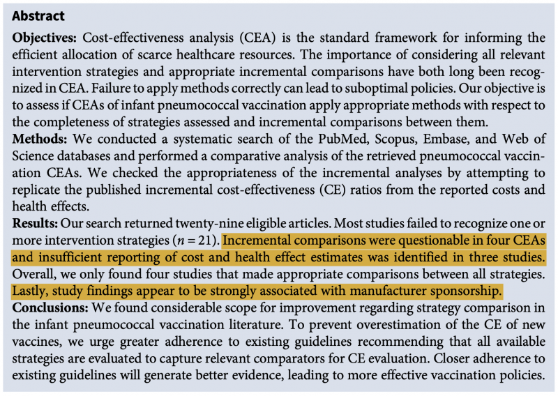 Eine systematische Übersichtsarbeit solcher Analysen zur Pneumokokken-Impfung konnte jetzt nachweisen, dass erstens die Mehrzahl dieser Analysen systematische Verzerrungen (in der Regel zugunsten der Impfung) aufwies und zweitens das Ergebnis maßgeblich durch die Finanzierung der Studien beeinflusst wurde. Herstellerfinanzierte Studien fanden - wenig verwunderlich - in aller Regel das günstigste Kosten/Nutzen-Verhältnis für den jeweils eigenen Impfstoff.