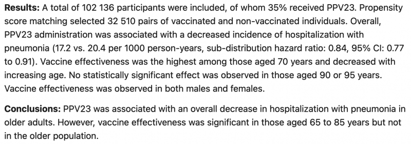 Eine große (N = 102.000) japanische Studie auf der Grundlage von Register- und Versicherungsdaten fand für die Pneumokokkenimpfung Älterer mit dem auch in Deutschland empfohlenen PPV23-Impfstoff eine Schutzwirkung vor der Hospitalisierung wegen Lungenentzündung von im Mittel 16%.