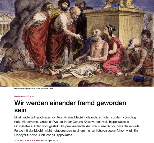 Einst plädierte Hippokrates von Kos für eine Medizin, die nicht schadet, sondern vorsichtig heilt. Mit dem medizinischen Wandel in der Corona-Krise wurden viele hippokratische Grundsätze auf den Kopf gestellt. Als praktizierender Arzt weiß unser Autor, dass der aktuelle Fortschritt der Medizin nicht notgedrungen zu einem menschlicheren Leben führen wird. Ein Plädoyer für eine Rückkehr zu Hippokrates.