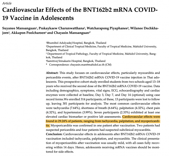 Eine prospektive thailändische Studie (relativ klein mit letztendlich 300 Teilnehmern) sucht erstmals gezielt nach Herz-Kreislauf-Nebenwirkungen nach Comirnaty und findet: