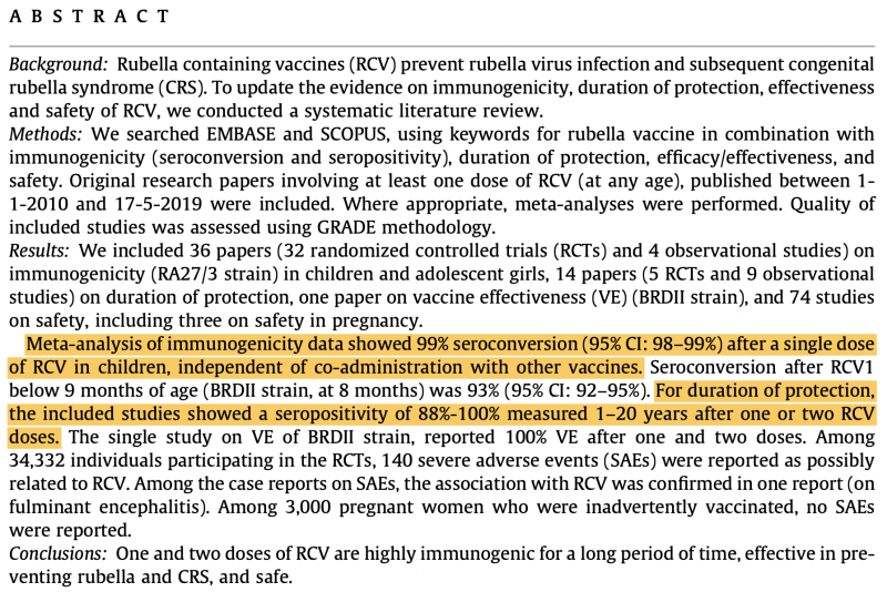 Eine systematische Meta-Analyse zu Umfang und Dauer des Schutzes durch eine Röteln-Impfung fand bei deutlich über 95% der Geimpften hohe und über Jahre anhaltende Antikörperspiegel nach nur einer Rötelnimpfung.