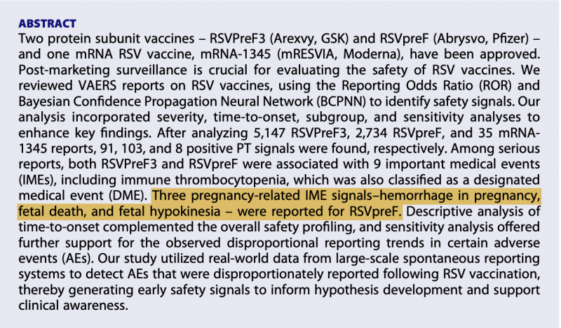 Eine Analyse des US-amerikanischen Meldesystems für Impf-Nebenwirkungen VAERS deckte neue Risikosignale der RSV-Impfung in der Schwangerschaft auf: nach Angaben der Autoren fanden sich bei geimpften werdenden Müttern sowohl Blutungskomplikationen, als auch verringerte Kindsbewegungen (fetal hypokinesia) und fetale Todesfälle nach der RSV-Impfung häufiger, als es im Bevölkerungsdurchschnitt zu erwarten gewesen wäre.