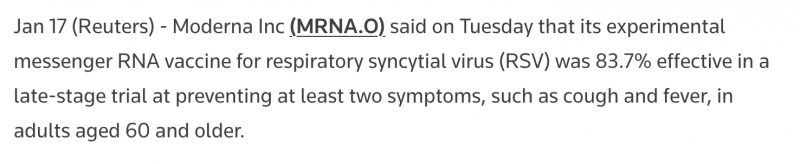 Moderna veröffentlichte eine Pressemitteilung, der in Entwicklung befindliche mRNA-Impfstoff gegen RSV-Infektionen Erwachsener habe bei Älteren eine Wirksamkeit von etwa 84% erreicht und habe sich "allgemein als sicher" herausgestellt.