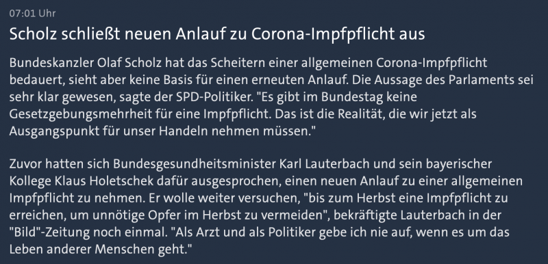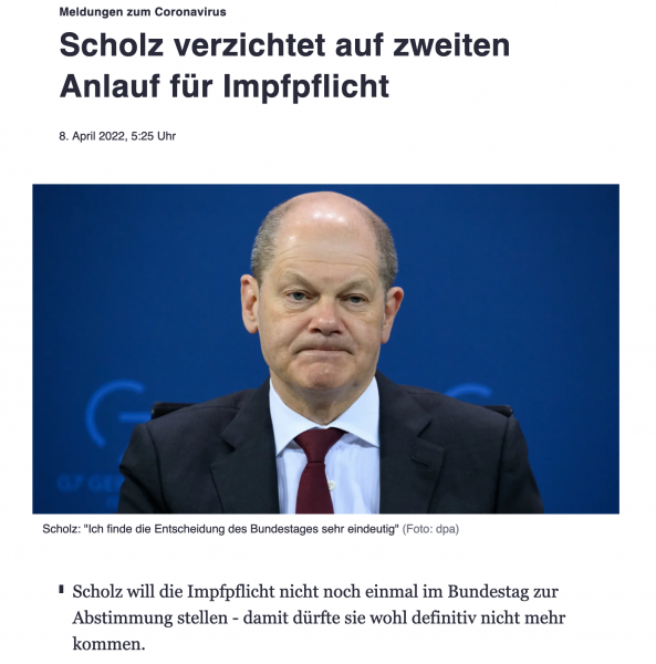 Scholz: einmal scheitern reicht bei der Impfpflicht - kein zweiter Anlauf geplant
