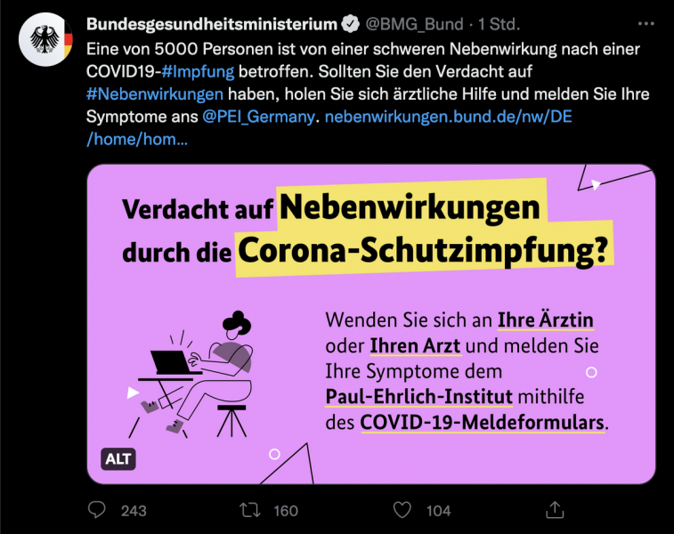 Eine von 5000 Personen ist von einer schweren Nebenwirkung nach einer COVID19-#Impfung betroffen. Sollten Sie den Verdacht auf #Nebenwirkungen haben, holen Sie sich ärztliche Hilfe und melden Sie Ihre Symptome ans @PEI_Germany. https://t.co/ajsedbBO7o pic.twitter.com/Z6jGxRfTW3