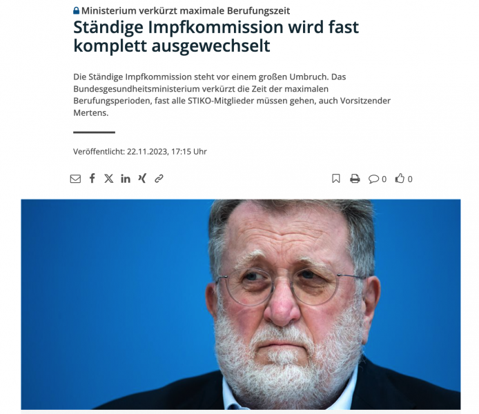 Das Bundesgesundheitsministerium erließ eine neue Regel, nach der die Kommissionszugehörigkeit auf 9 Jahre bzw. drei Berufungsperioden begrenzt ist. Dies kostet u.a. den bisherigen STIKO-Vorsitzenden Prof. Thomas Mertens seinen (ehrenamtlichen) job.