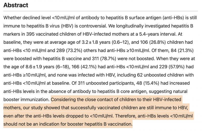 auch Kinder, die zu Studienbeginn einen Anti-HBs-Wert ≤ 10 mIU/mL aufwiesen, zeigten im Laufe mehrerer Jahre einen signifikant messbaren Anstieg dieser Werte, ohne jedoch an Hepatitis B zu erkranken. Der Kontakt mit ihrer Mutter hatte sie offenbar - so folgern die Autoren - "natürlich geboostert", die vorherige Impfung hatte sie aber, trotz des nach RKI-Maßstab viel zu niedrigen Titers, zuverlässig vor einer Erkrankung geschützt.