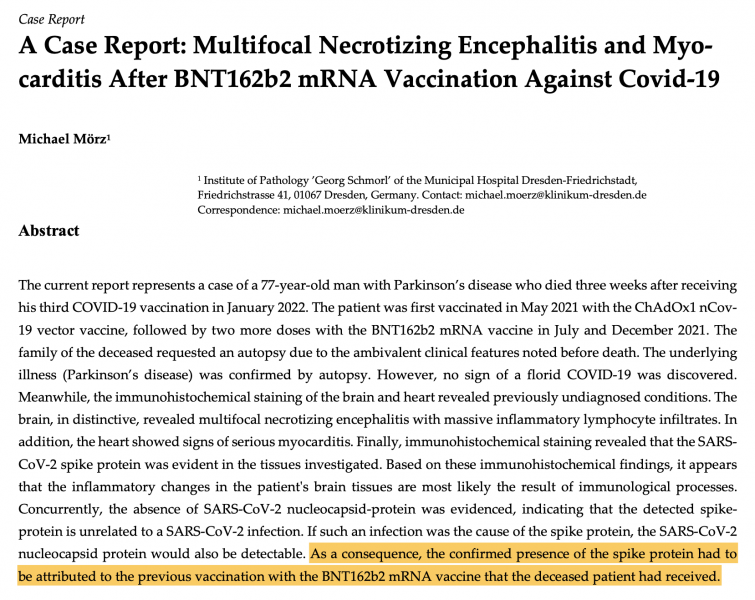 77-Jähriger Patient (Vorerkrankung Parkinson) erhält AstraZeneca und 2 mRNA-Impfstoffe gegen Covid und verstirbt 3 Wochen nach der letzten Impfung. In der - von den Angehörigen eingeforderten - Autopsie fand sich Spike-Protein im entzündeten Herz- und Hirngewebe.