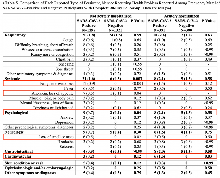 Statistisch signifikante Unterschiede finden sich nur bei allgemeiner Erschöpfung/Schwäche, Appetitverlust/Gewichtsabnahme, allgemeinen psychologische Folgensymptomen, Geruchs- und Geschmacksverlust. Bei all diesen Symptomen fällt jedoch auf, dass die Unterschiede nur bei den weniger stark erkrankten Kindern signifikant waren. Bei denen, die wegen Covid hospitalisiert werden mussten, fand sich kein signifikanter Unterschied - was die Plausibilität der Ergebnisse in Frage stellt.