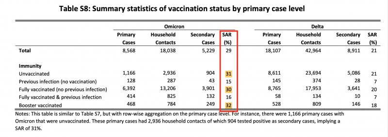 The most important table in below study of 🏠 transmission of delta & omicron, where unvaxed convalescent were pooled as vaccinated, speaks for itself hidden away on p. 12 of the supplementary data... (https://t.co/c8bSSzisPx)