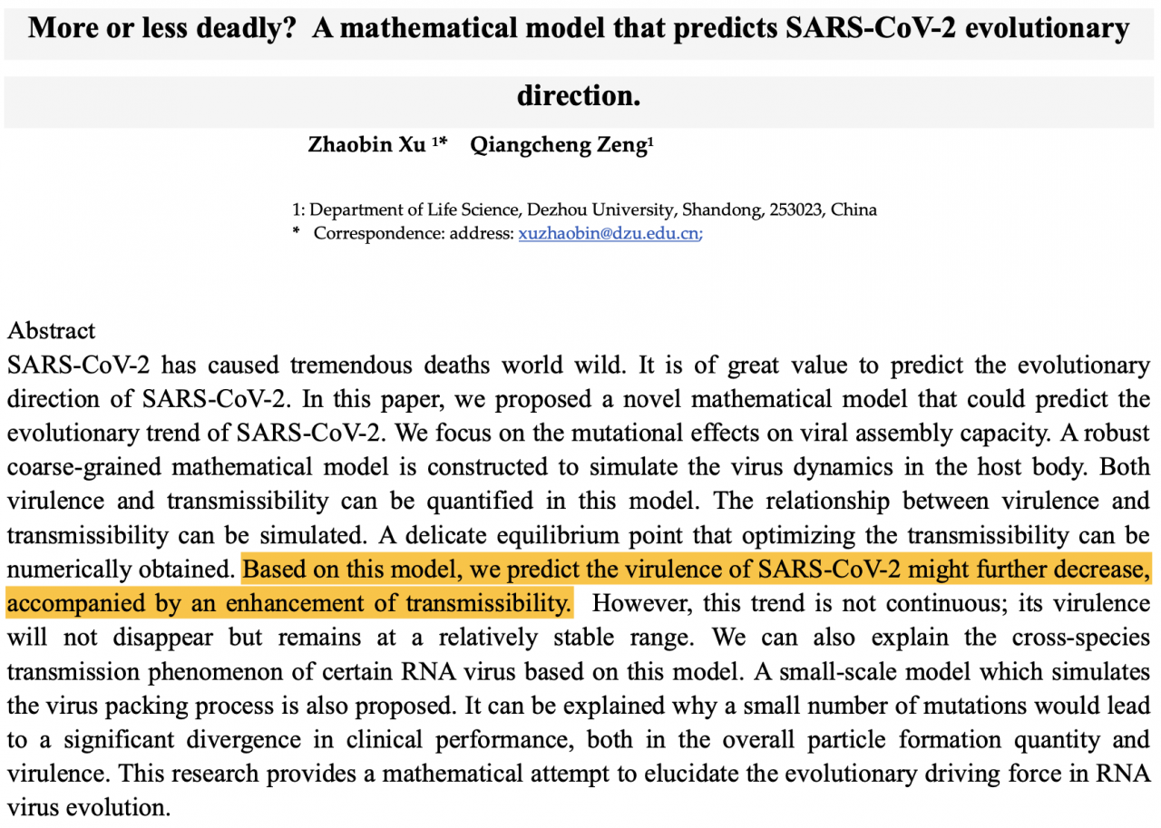 ... folgt man diesem mathematischen Modell (Leser meines blogs wissen, dass ich ein eher angespanntes Verhältnis zu mathematischen Modellen habe...) klar in Richtung: ansteckender und weniger virulent. Damit deckt sich das Modell mit allen Prognosen seriöser Virologen...