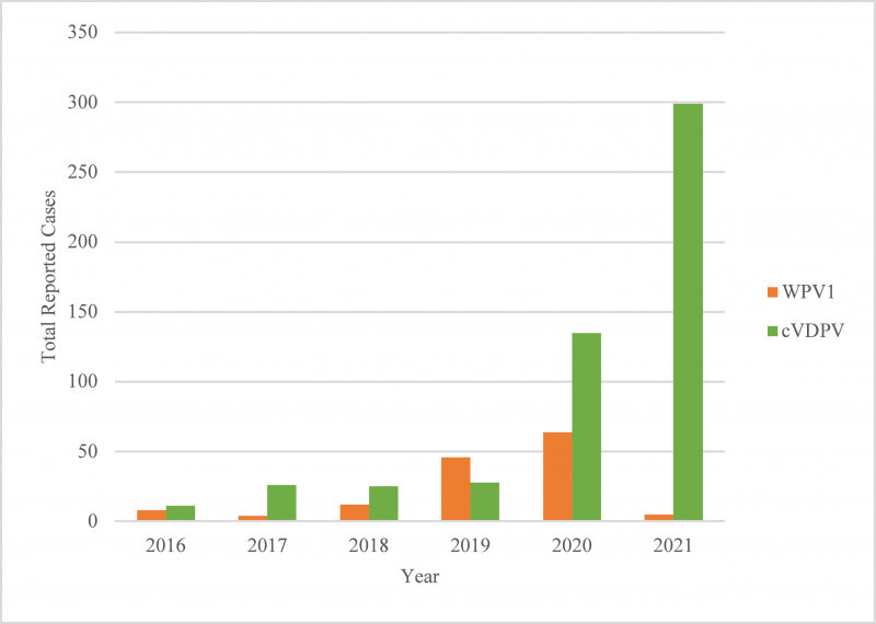 Hier die Entwicklung zwischen Wild-Polio-Fällen (WPV) und Impf-Polio-Erkrankungen (cVDPV):