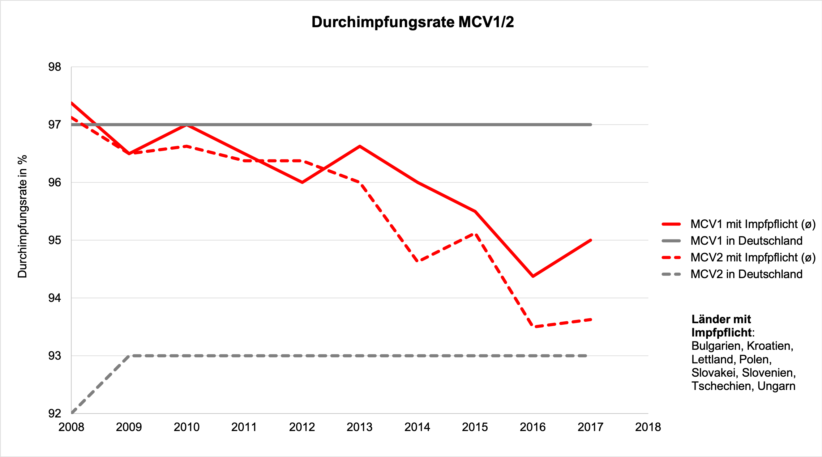 Bei der MCV1 erreicht Deutschland auf freiwilliger Basis seit Jahren höhere Durchimpfungsraten als der Durchschnitt der Länder in der EU, die eine Masernimpfpflicht eingeführt haben (Rabe 2019c):