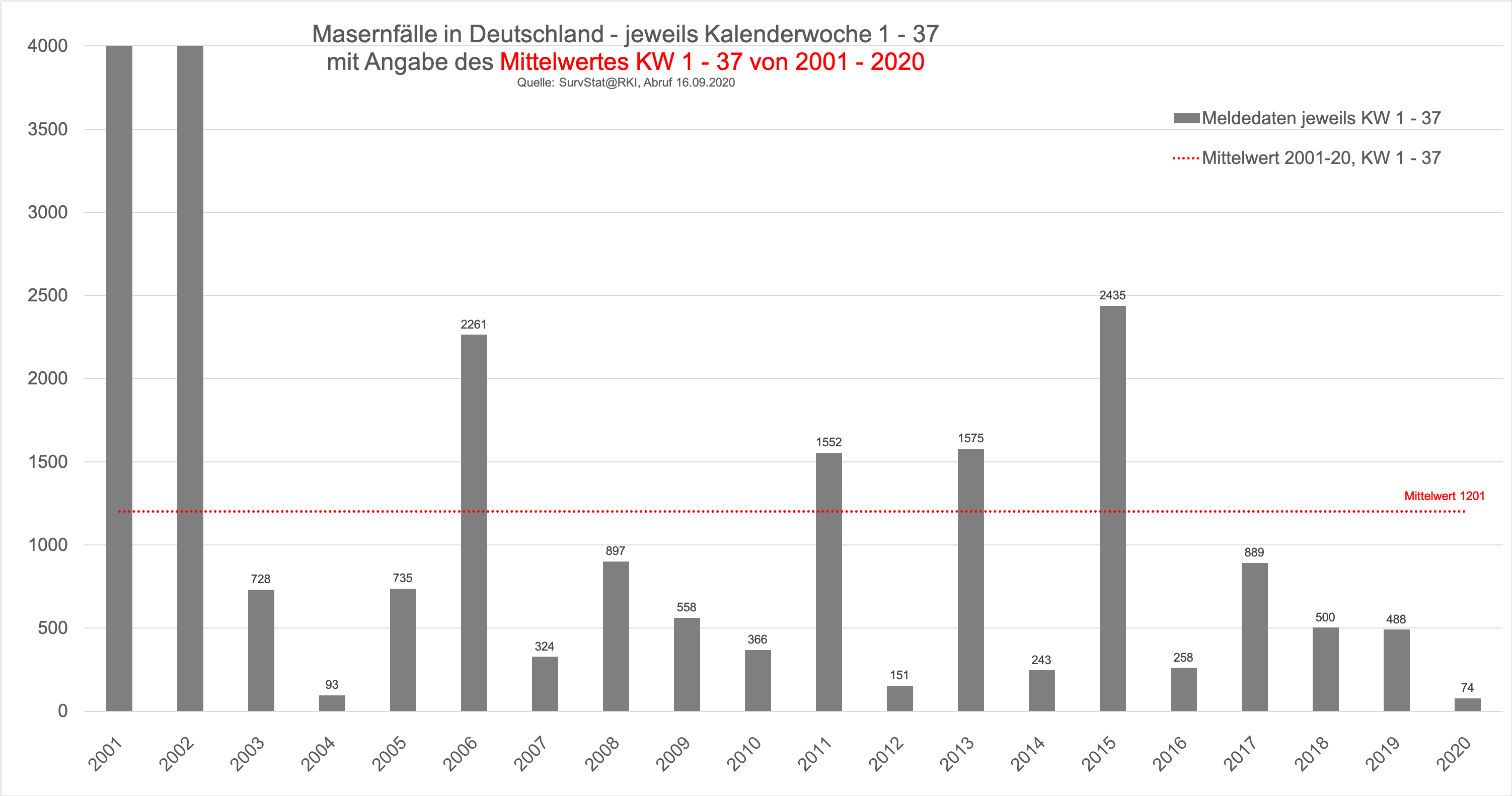 Zu den angeblich steigenden Fallzahlen, hier die Zahlen des RKI seit 2001 zunächst nach Jahren: