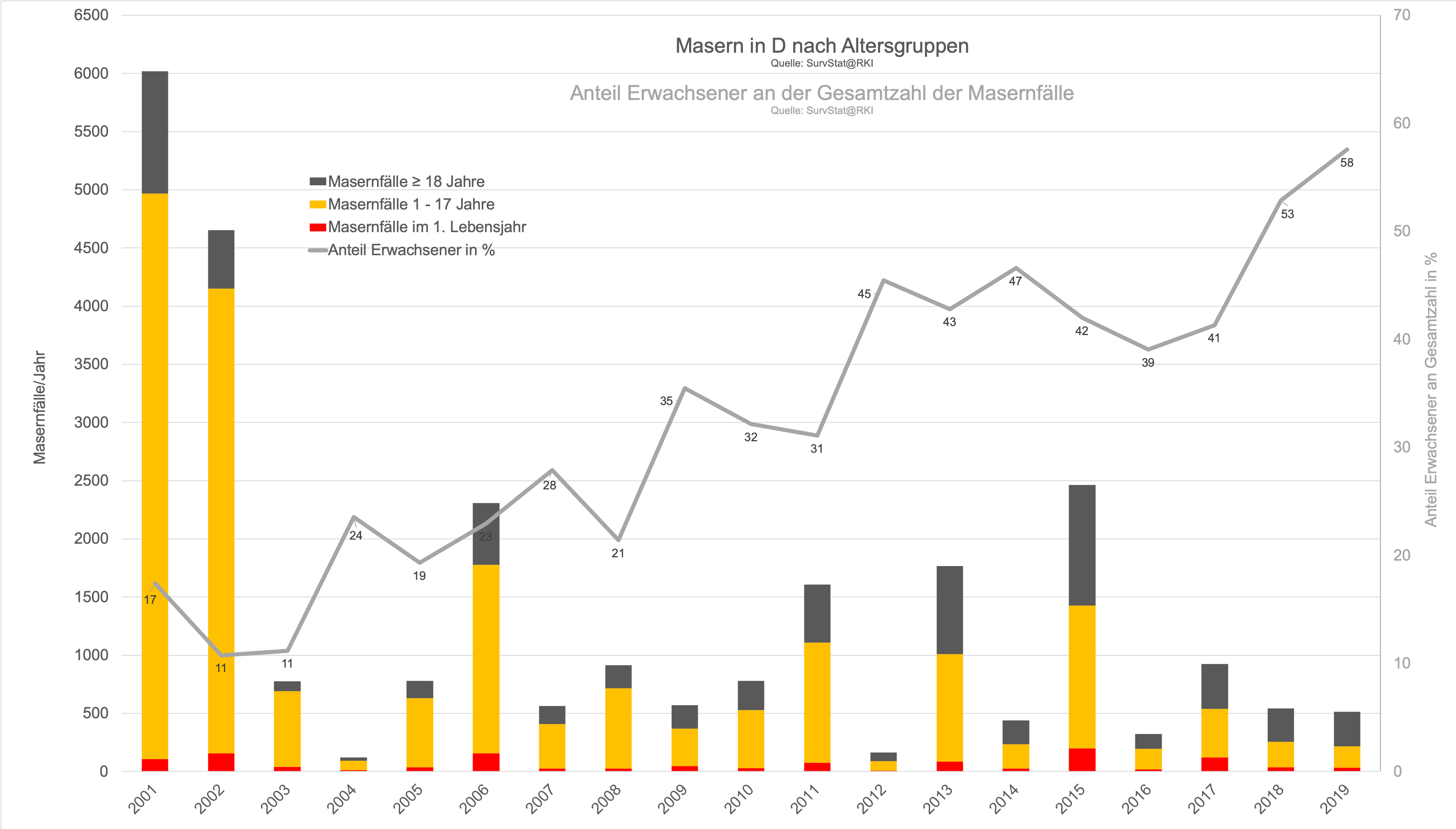 Dies spiegelt sich auch in der Epidemiologie der Masern in Deutschland – seit 2001 nimmt der Anteil der Erwachsenen an den Gesamtfallzahlen kontinuierlich zu und liegt seit 2018 über 50 Prozent (SurvStat@RKI).