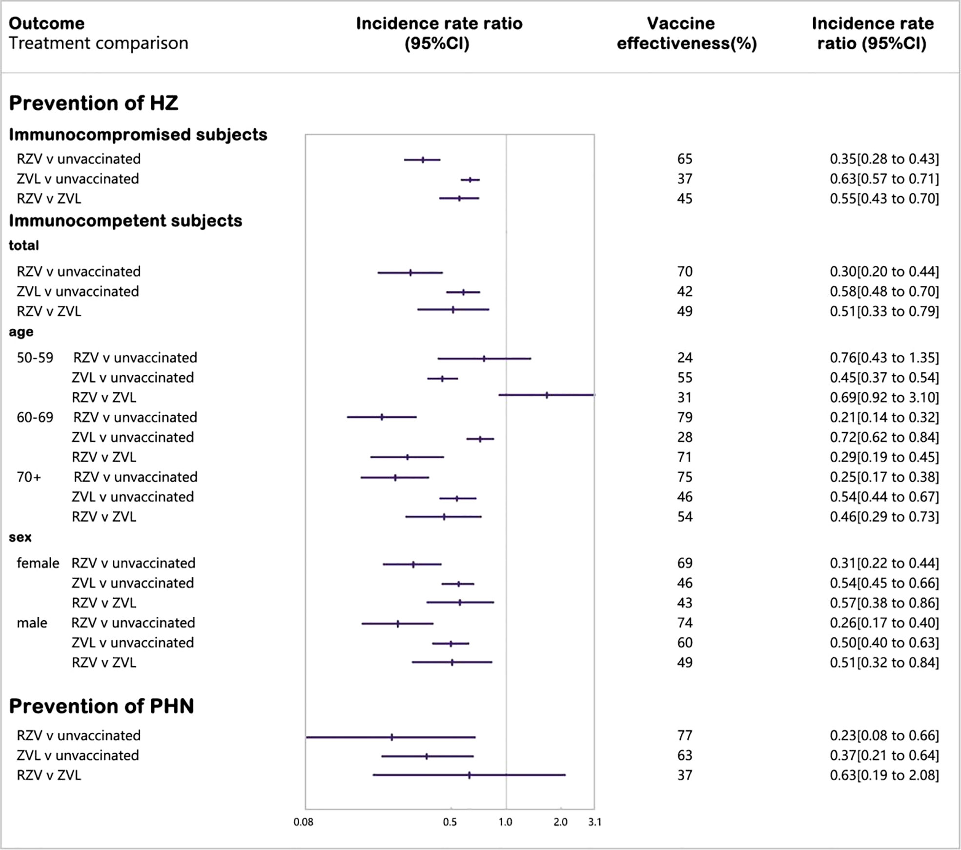 Hier die Angaben zur "real-world"-Effektivität von Shingrix (RZV) und Zostavax (ZVL) im Überblick und im Vergleich zueinander aus einer großen Metaanalyse von 2022 (Xia 2022):